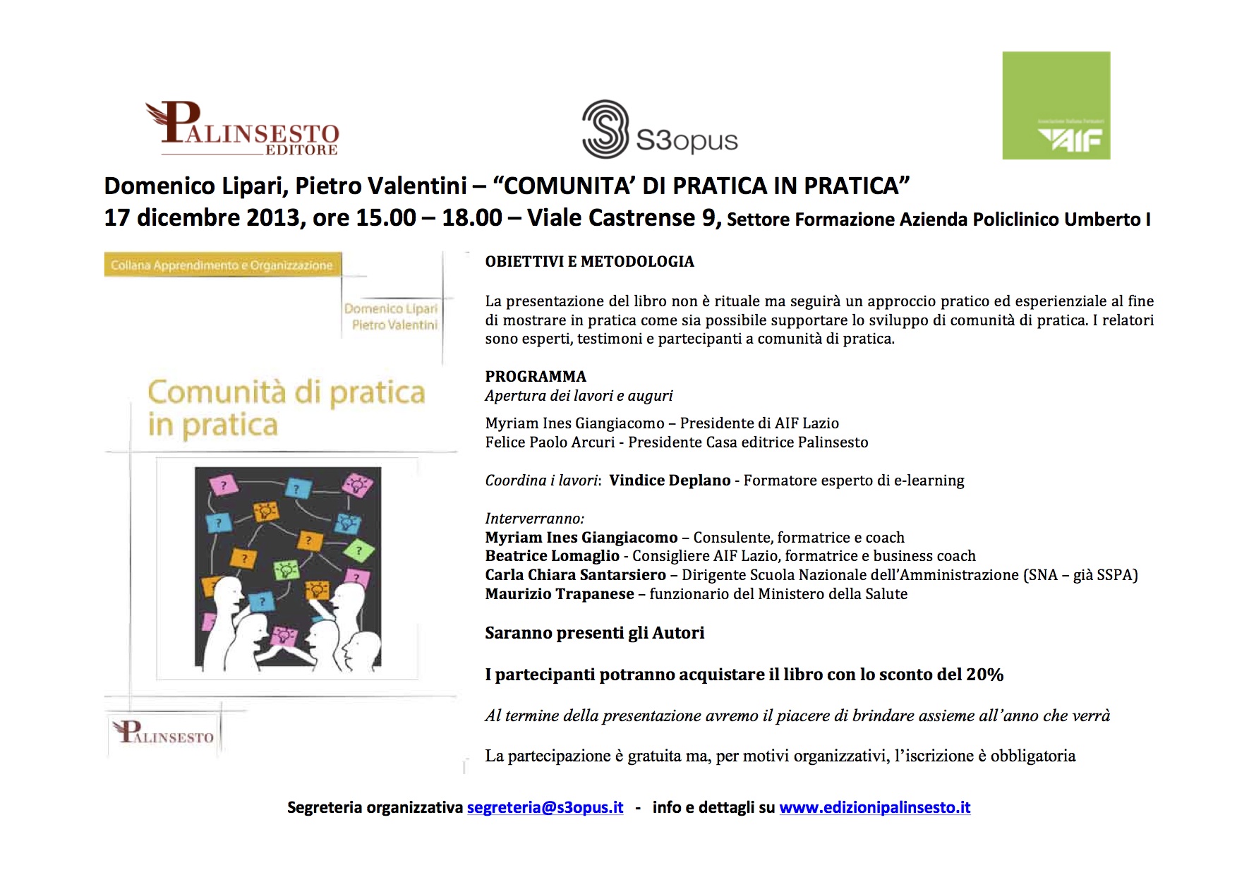 Il 17 dicembre Mimmo Lipari e Piero Valentini presentano il loro ultimo lavoro, “COMUNITA’ DI PRATICA IN PRATICA”, dalle ore 15.00 alle 18.00 – a Viale Castrense 9, nel Settore Formazione Azienda Policlinico Umberto I. Il lavoro che entrambi fanno, da anni, sulle comunità di pratica, è una risorsa di intervento preziosa e in qualche modo rivoluzionaria, poiché centrata su un ascolto che è organizzativo ma anche soggettivo e gruppale, e soprattutto “non mente”. In tempi di storytelling selvaggio, ogni modello che parte e approda a una narrazione autentica è preziosa e combattente. . Quello che nella vita ho imparato da Mimmo Lipari sulla consulenza alle organizzazioni ha per me ancor oggi (mentre il concetto di organizzazione si rifà stringente e angusto a partire da una crisi che rende impossibile investire davvero su benessere e innovazione) una leva di fondo: l’onesta necessaria che deve essere praticata e vissuta quando si ascolta, si aiuta a far emergere e si propone a un dialogo organizzativo il vissuto dei “lavoratori” nei “luoghi”, come risorsa vera, “ereditabile” e “rinnovabile”, magma incandescente e non sempre comodo per l’innovazione e la crescita per “scoperta”. La presentazione del libro ha le caratteristiche di una esperienza, e quindi accosta vissuto e racconto, ed è una bella occasione per ritrovarsi a veder vivere l’incontro fra chi legge e chi si mette in gioco. Una presentazione esperienziale, che in tempi che come questi si nutrono di autoreferenzialità, scommette sulla condivisione e sul confronto. Auguri a Mimmo e a Piero per il loro nuovo libro, con molta curiosità per il pomeriggio che ci condivideranno.