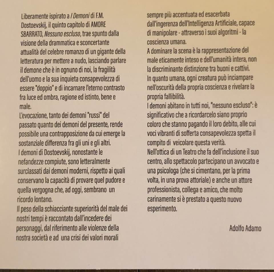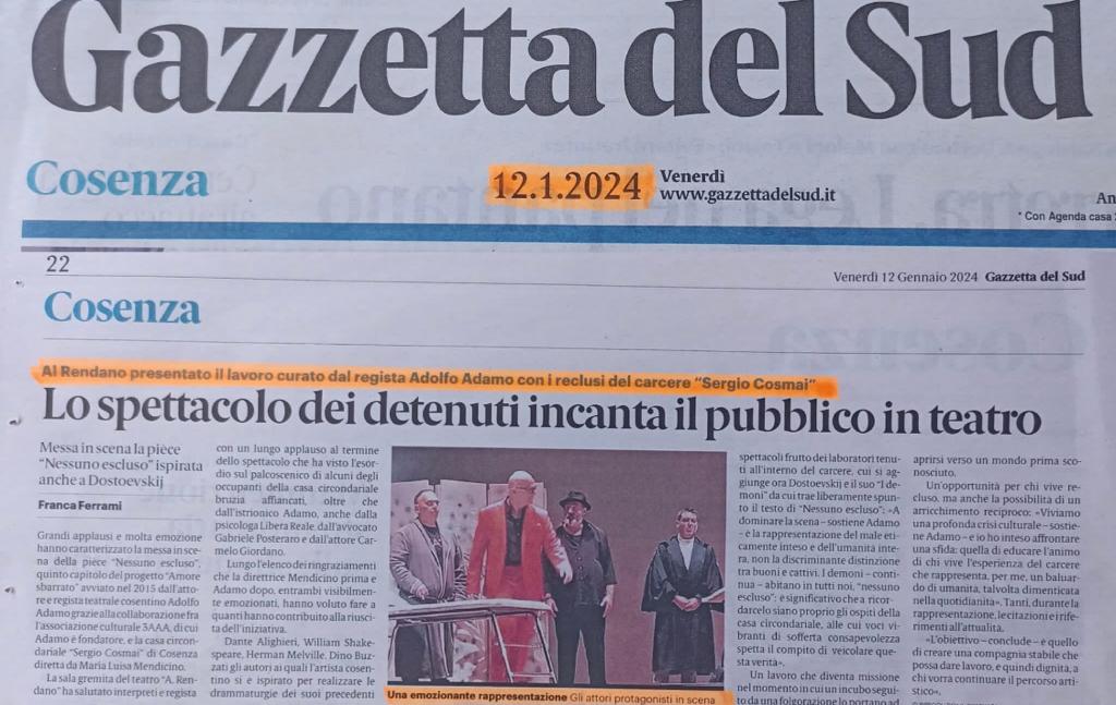 Il suo lavoro in progress Amore sbarrato è oggi al capitolo V, collabora con la Camera Penale di Cosenza (qui l’articolo e il video che ce ne danno conto), ed è qui che ha portato al Teatro Rendano la sua Compagnia. Il salto di qualità si compie oggi con la costruzione di due compagnie stabili nelle carceri, portando a piena espressione la scommessa umana, artistica e sociale di Adolfo