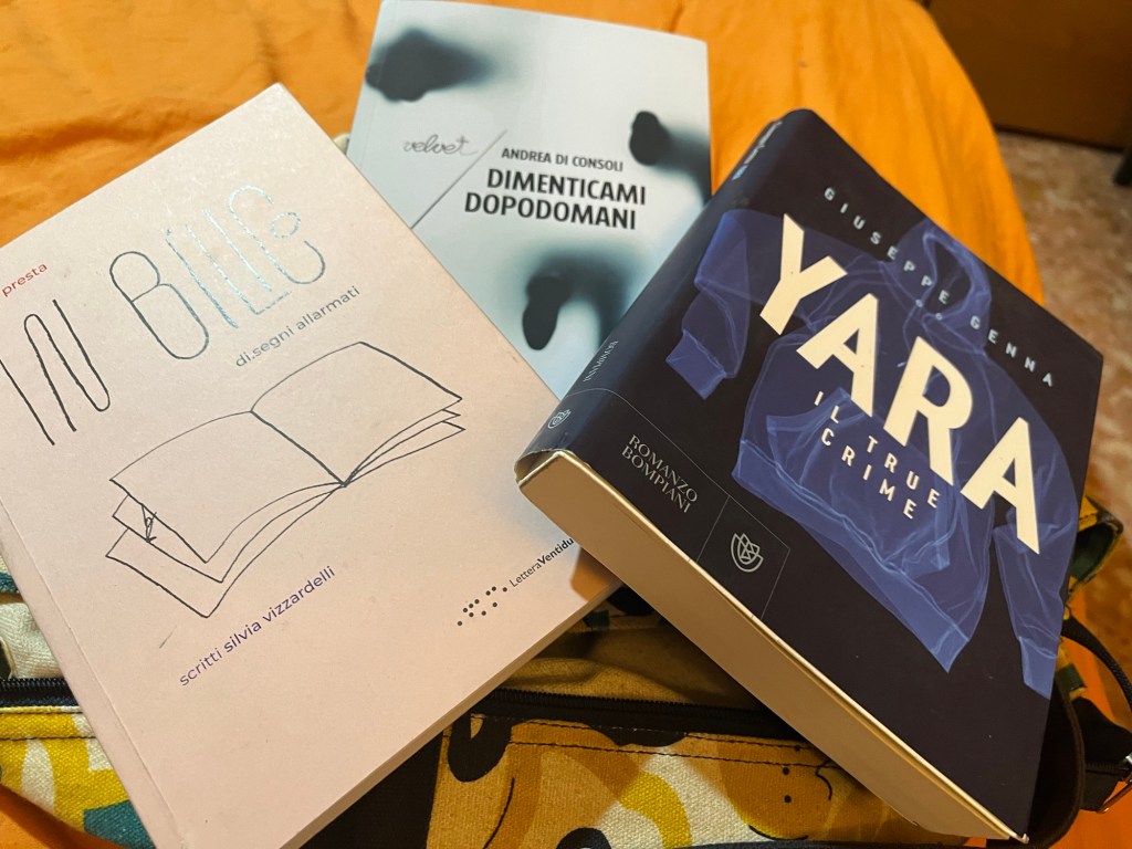 I tre libri, in foto sotto, sono Yara, il true crime, di #GiuseppeGenna; In bilico – di segni allarmati, di #AldoPresta; Dimenticami dopodomani, di #AndreaDiConsoli.