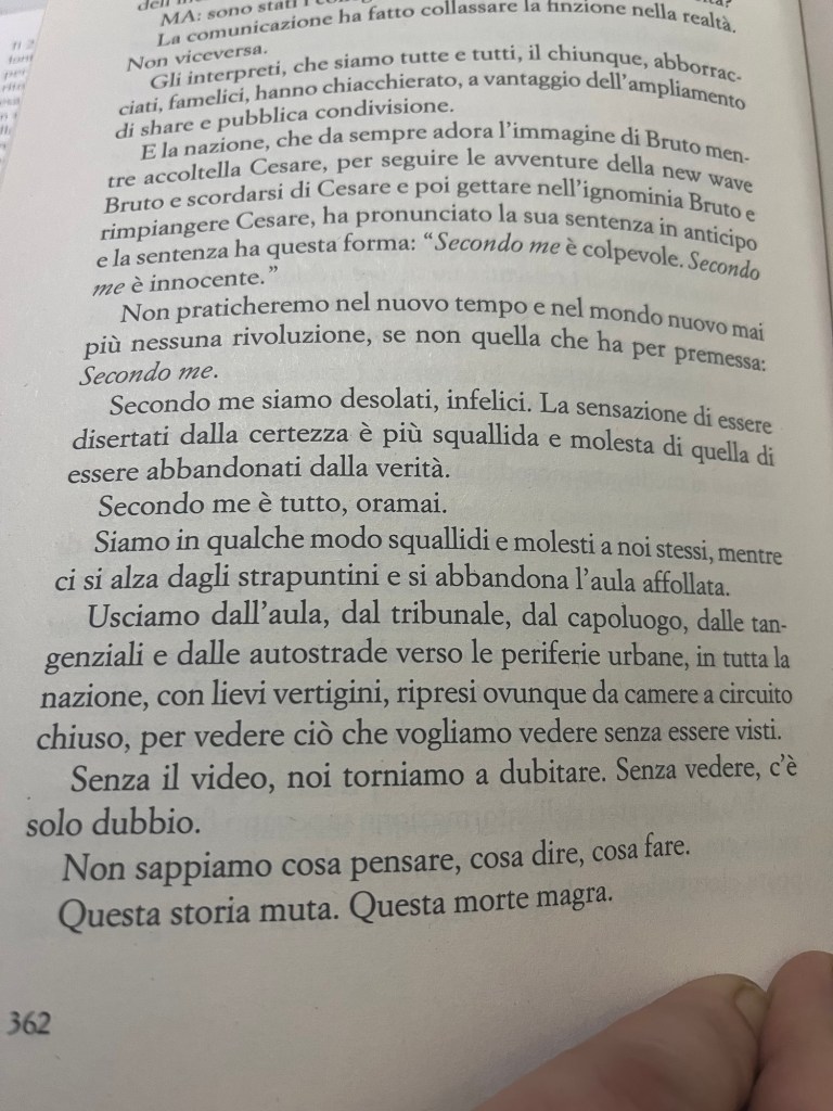 Parto da Genna, dalla sua poetica dell’insostenibile, dello strazio del corpo dell’altro, della crocifissione laica. Della perdita struggente del desiderio di una dignità umana. Della caduta nel “secondo me.” Pochi come Giuseppe Genna descrivono i luoghi, e la reazione del corpo interno e della pelle ai luoghi. Le periferie, le funzioni funebri, le aule dei tribunali, la trama della cronaca. Quello che siamo. Quello che viviamo. Ecco, io di quel libro, Yara, andando a votare, non devo dimenticare nulla. La mia scelta deve ricordare cosa è andato perduto, quale strada non siamo più abilitati a percorrere, nemmeno dentro. E “quale rivoluzione non avremo mai più“.