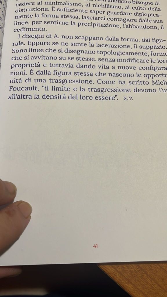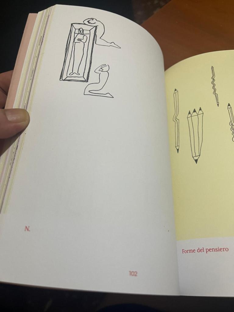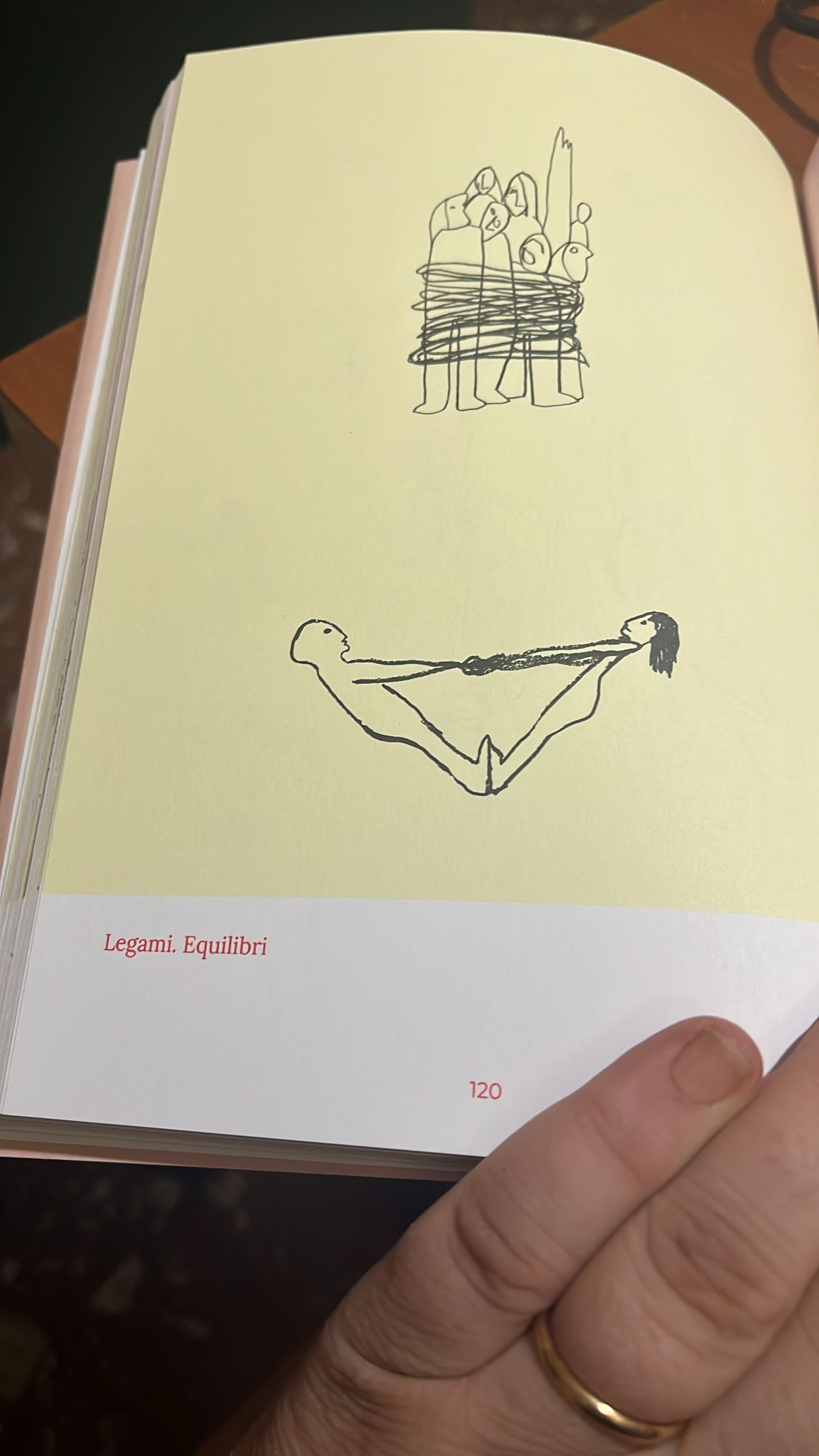 Passo ad Aldo Presta, con un po’ di fatica perché la vicinanza natale, in qualche modo, se da un lato non entra in gioco, dall’altra mi ha sorpresa, a tratti, come se quell’”in bilico” si fosse fatto materia del mio, in un nostro, un po’ nostro passo sospeso. È un libro per immagini. Schizzi, sintesi grafiche di poetiche e poetiche, piccole prose che fanno parte del libro senza che se ne sposti la forma. Ed è la cosa più politicamente schierata che abbia letto, come intelligentemente annota la coautrice per la parte testi Silvia Vizzardelli, quando dice: “È importante acutizzare il senso del segreto che accompagna le nostre parole, le nostre azioni, i nostri gesti. Non coincidere coi nostri atti, avvertire un disordine, una cicatrice, una inadeguatezza: questo significa offrire una chance all’origine”. Le più belle pagine sul femminicidio le ho lette qui. Così come è magistrale quel tratto che passa a volte fino a de-scrivere senza lasciare il foglio, che si compone su una pagina che scompone la scena, che va da pieni a vuoti che non sono vuoti mai, che piuttosto “tengono” quel qualcosa che non sappiamo se sia passato giù, inghiottito, o forse ancora sia lì a ridirsi bisognoso di argine. Verdi verticali che liberano gli alberi, ed una tavola che si dichiara sempre come atto d’amore, nonostante il dolore, nonostante le domande e il rischio di quello sbilanciamento che non avviene. Che tiene.