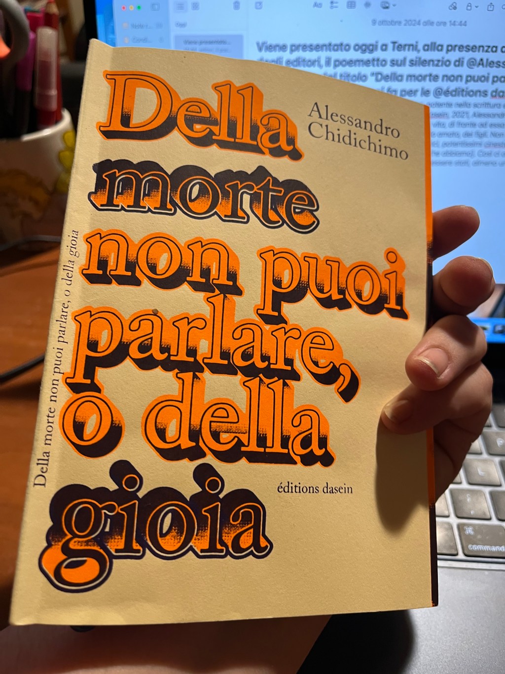 Viene presentato oggi a Terni e l’11 a Cosenza, alla presenza dell’autore e degli editori, il poemetto sul silenzio di Alessandro Chidichimo dal titolo “Della morte non puoi parlare, e della gioia”, uscito pochi mesi fa per le éditions dasein.