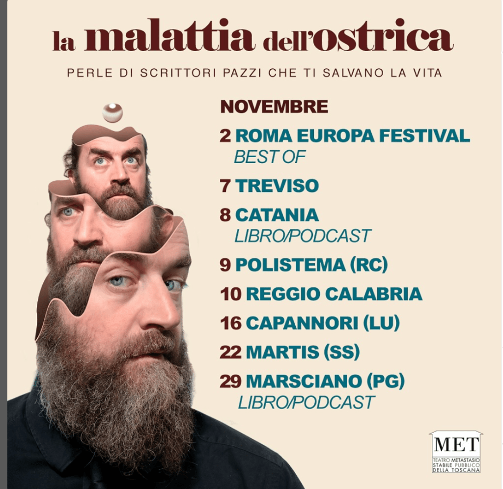Il 20 di ottobre, in una Roma calda che pare dire di giugno, siamo andati con l’esposo a vedere Morici, con il suo La malattia dell’ostrica al Parco della Musica. Sala piena, età compresa fra i 30 e gli 80, calore umano superiore alle aspettative così come per il calore del venticello serale. Che bello spettacolo, che incontro pieno di vita, sebbene incroci di continuo, a ogni passo, la domanda su cosa fatti i conti ci aiuti a vivere. Vivere, non tirare avanti. Il pubblico è pieno di nostalgici liceali e ginnasiali di tardo 900, come me e l’esposo, ma anche tanti 30enni e quarantenni, nati quando noi tremavamo per il Rapimento Moro. Lo spettacolo Morici dovrebbe portarlo in Auditorium nelle scuole e nelle facoltà: di lettere, filosofia, matematica. Farebbe bene da morire ai ragazzi e ragazze, e agli insegnanti. Gremito il testo e il vissuto di Morici di ascolto attento di una contemporaneità che grida il suo disagio adolescenziale con autotune , pieno di amore genitoriale per il momento terribile in cui parliamo coi nostri figli dal telefonino e da whatsup dietro porte spesse accuratamente ben chiuse, che ci svela qualcosa che a noi è sconosciuto: loro crescono con pari struggente bellezza a metà fra i pari, a metà in un segreto solitario smarrimento. Più di noi soli, più di noi profondamente isolati. E’ il racconto di un rapporto padre-figlio, è il racconto della potenza dell’atto creativo, è il racconto della letteratura che cura. Tratti deliziosamente ironico-grati sulla presenza novecentesca della psicoanalisi nelle nostre vite, dell’approccio junghiano così s-piazzante. E’ la storia del lavoro creativo fra novecento e millennio nuovo, con le sue trappole incastri, sconvenienze e turbolenze. Ironia intelligente e acutissima su piccoli e grandi editori, sui dati statistici sul disagio mentale, rivisti rivisitati, accarezzati sul corpo testuale e fisico delle grandi figure quasi tutte del 900. Ogni nome un brivido, una visione, un riso amaro e intenerito, una carezza sulla domenica delle salme composta il 30 da Claudio Morici a teatro. Bravo, bravissimo, presenza scenica altissima. Disillusione cauta, un guaito che anche noi, oggi, lasciamo uscire fluire amplificato, echeggiato, reso basso e lungo dall’autotune dell’essere in una fortezza vuota. Sperando di essere rac-colti. Come Bruno Bettelheim, non a caso rivisto mentre scrivo, con la sua busta dolorosa sul capo che reclina piano. Grazie Morici, grazie di cuore.