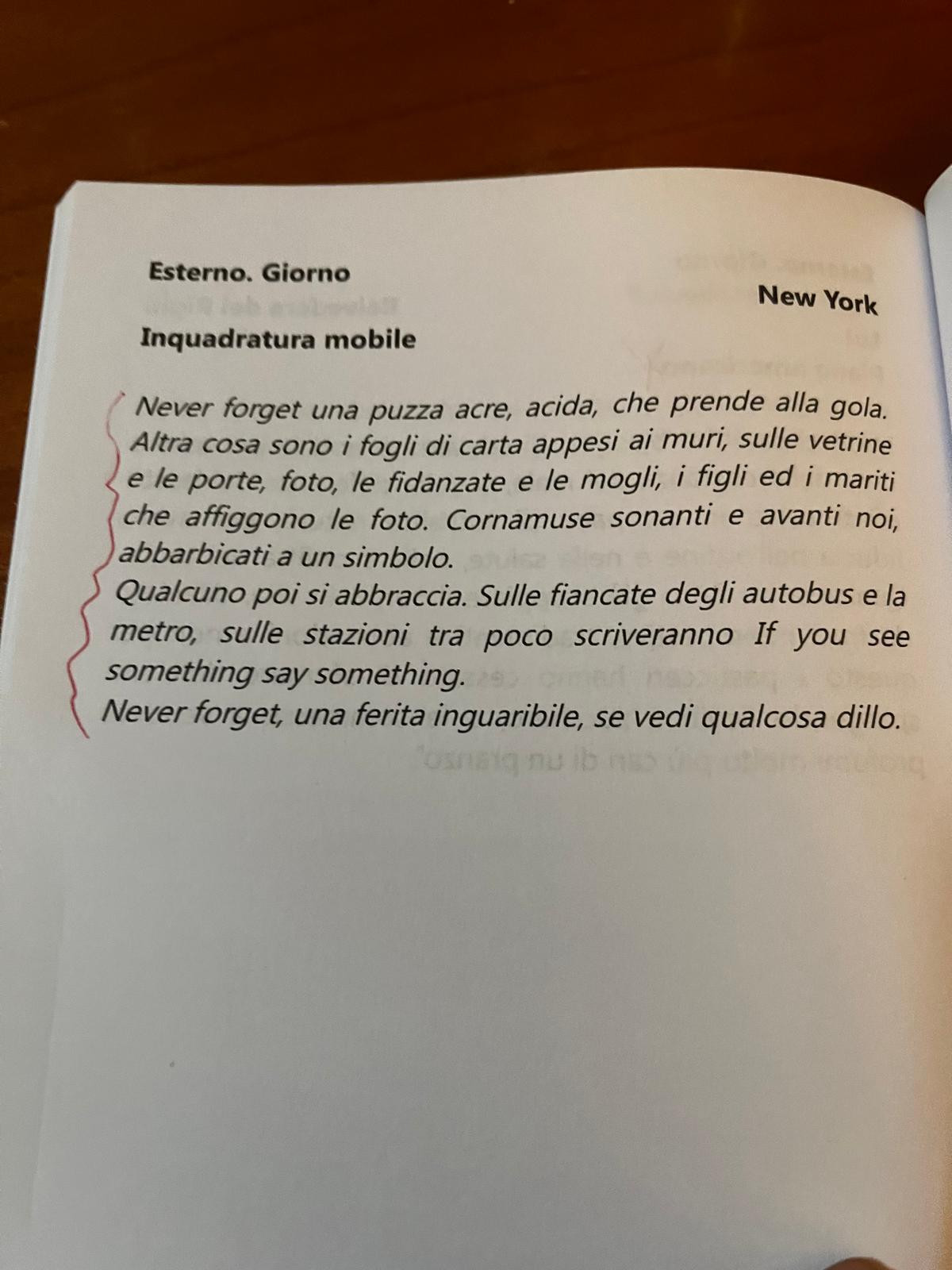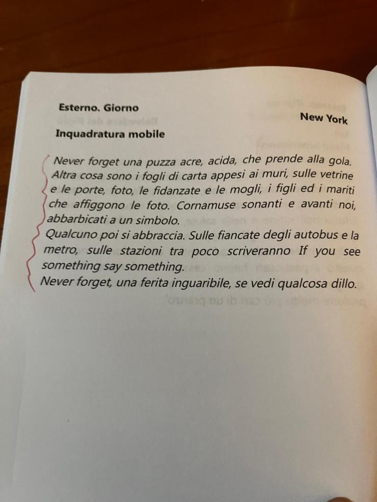 Credo che l’11 settembre segni un punto di non ritorno nella storia del nostro tempo, qualcosa che ha a che fare coi detriti del crollo, coi detriti del quotidiano, con la sensazione che proviamo quando possiamo parlare, sentirne e forse dirne “dopo”.