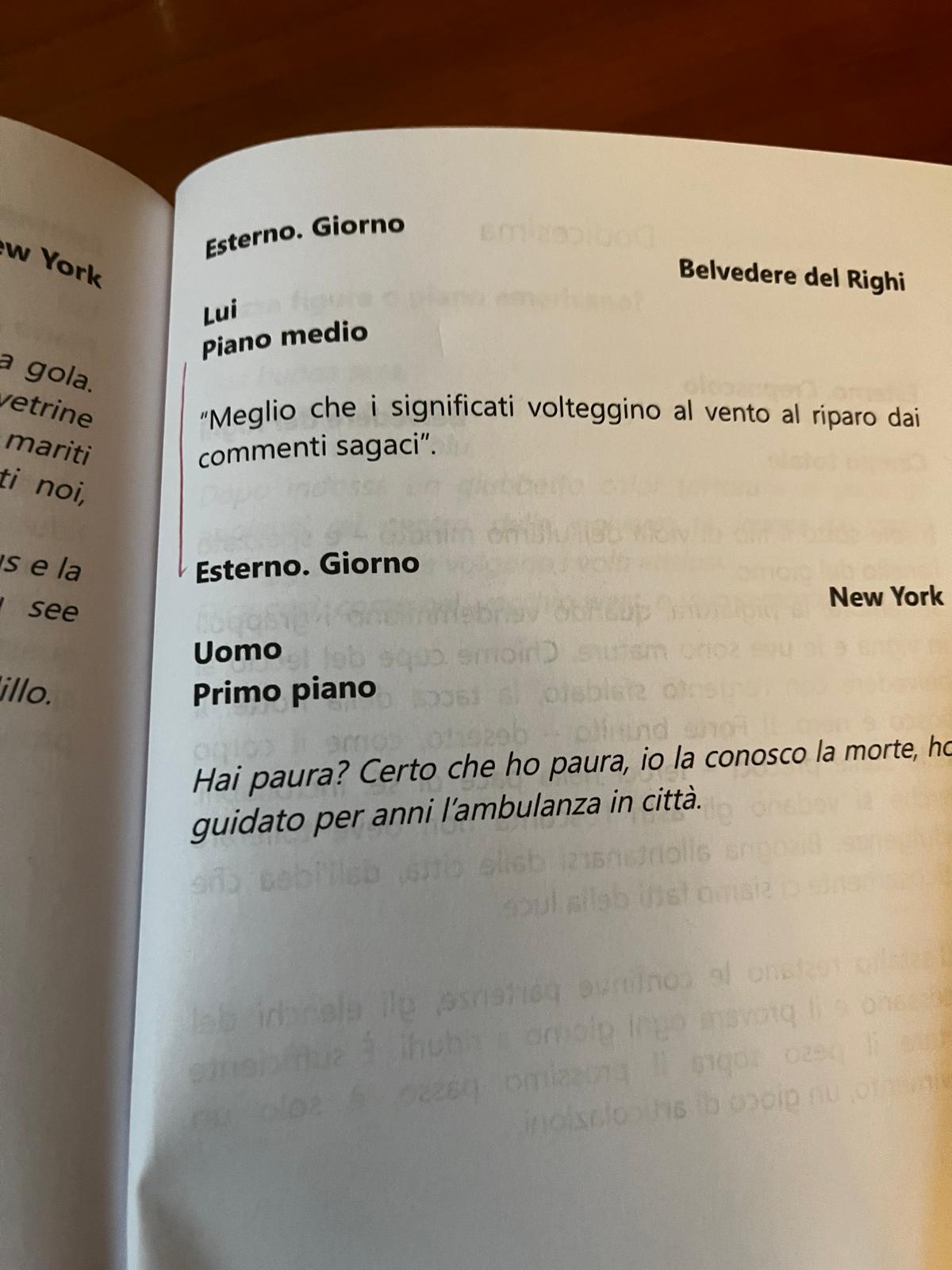 Potremmo leggere questa silloge come una sceneggiatura, con le sue indicazioni di campo e tempo. Eppure, ho preferito leggerla nella sua dimensione di flusso di coscienza, in un certo senso appropriandomi di un mio personale angolo visuale. Ho ascoltato le parole attraversare il silenzio, e qui la seconda associazione, come nella Berlino wendersiana.
