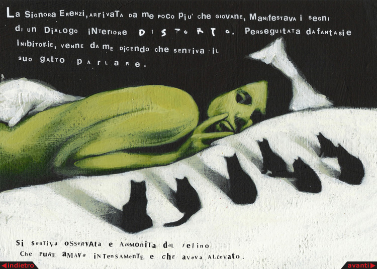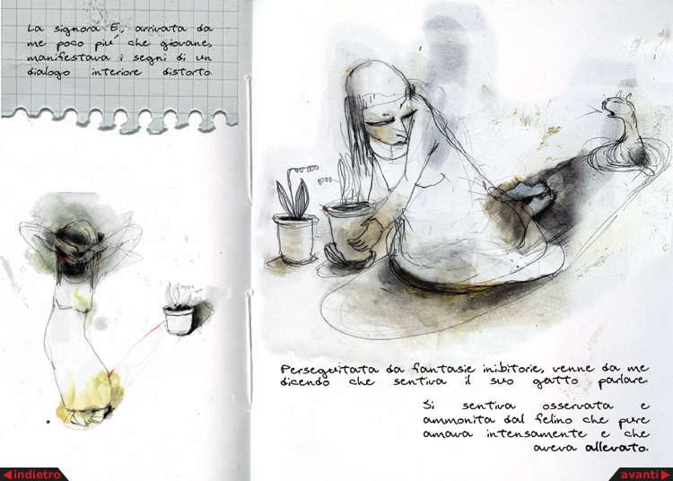 23 novembre. La paziente Chiara Erenzi ha lasciato lo studio. Oggi è l’ultimo giorno di una lunga terapia durata più di dieci anni. La signora Erenzi, arrivata da me poco più che giovane, manifestava i segni di un dialogo interiore distorto. Perseguitata da fantasie inibitorie, venne da me dicendo che sentiva il suo gatto parlare. Si sentiva osservata e ammonita dal felino che pure amava intensamente e che aveva allevato. Accusava frequenti attacchi di panico che le impedivano lo svolgimento di una vita normale. Ogni luogo che fosse troppo ampio o troppo stretto, provocava nel suo animo l’ingestibile sentimento della morte imminente, come se da ogni ponte si dovesse necessariamente precipitare, e ogni ascensore dovesse divenire un sasso scagliato verso il confine basso. Negli anni trascorsi abbiamo lavorato molto, inseguendo il rizoma delle sue proiezioni. La sua empatia disegnava la rete delle inestricabili radici di una pianta incapace di dirimere le maglie di una attenzione patologica. Era ed è, la signora Erenzi, inguaribilmente malata. Di un amore improvviso e duraturo e incapace di separazioni. Nutre per tutto ciò che tocca un amore malsano e tumorale, che le impedisce di recidere le escrescenze malate delle proprie radici per reggersi da sola. La signora Erenzi è avvinta al mondo. Come uno spazzino che pratichi il mestiere da secoli, è una collezionista di carbone, così dunque il suo corpo pesa davvero troppo e riesce a far crollare i ponti. Nelle grandi piazze, non potendo abbracciare con le sue radici gli sterminati confini, si sente morire, come un albero le cui radici non tengano. Conclude oggi la sua analisi, portando con sé, come una sposa il suo strascico, le radici ancora impigliate anche a questo lettino. Uno strascico bianco legato per sempre. Per questo la vedo oggi, mentre scrivo, vagare per le strade con il suo ennesimo fardello, un corpo piccolo, un grande manto, e mille oggetti impigliati nelle frange. Il dottore chiude l’agenda, la luce nella stanza si fa fioca. Cinque mq di bianco e molti oggetti in legno. Un mappamondo, una maschera, un antico telaio. Dai suoi piedi, verdi radici. Scendono piano nel pavimento e scavano il suolo, fino a perdersi da un piano all’altro, nel ventre oscuro del palazzo.